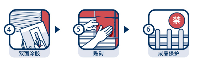 | 施工事項(xiàng): | 瓷磚背面應(yīng)干燥且無浮灰。在開放時間(一般為20分鐘)內(nèi)完成瓷磚的揉壓粘貼。禁止無縫貼磚,磚縫不小于2mm。建議使用齒刮刀在基層與瓷磚背面同時薄刮瓷磚膠粘劑進(jìn)行雙面涂膠。攪拌好的膠漿須在2小時內(nèi)用完。 |